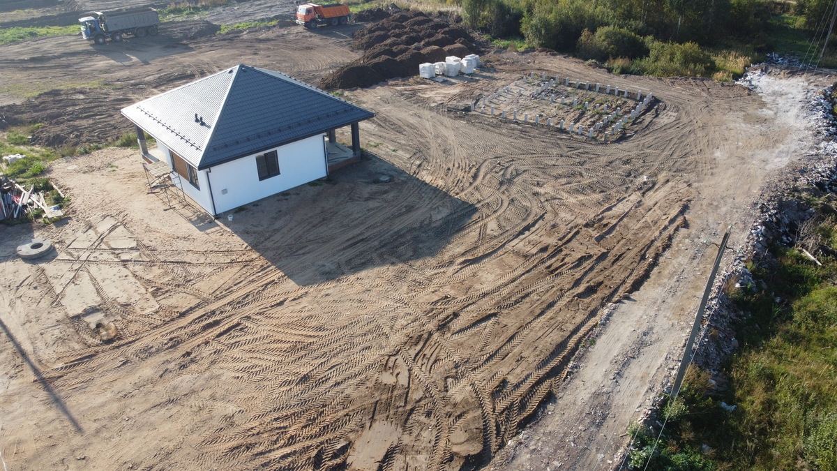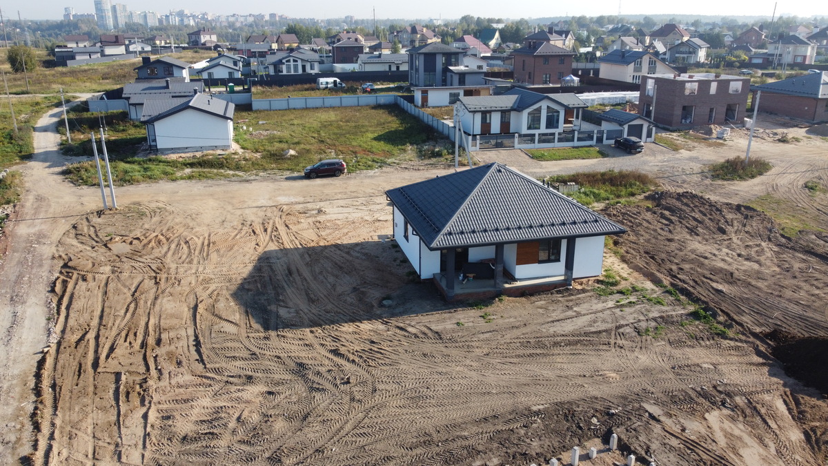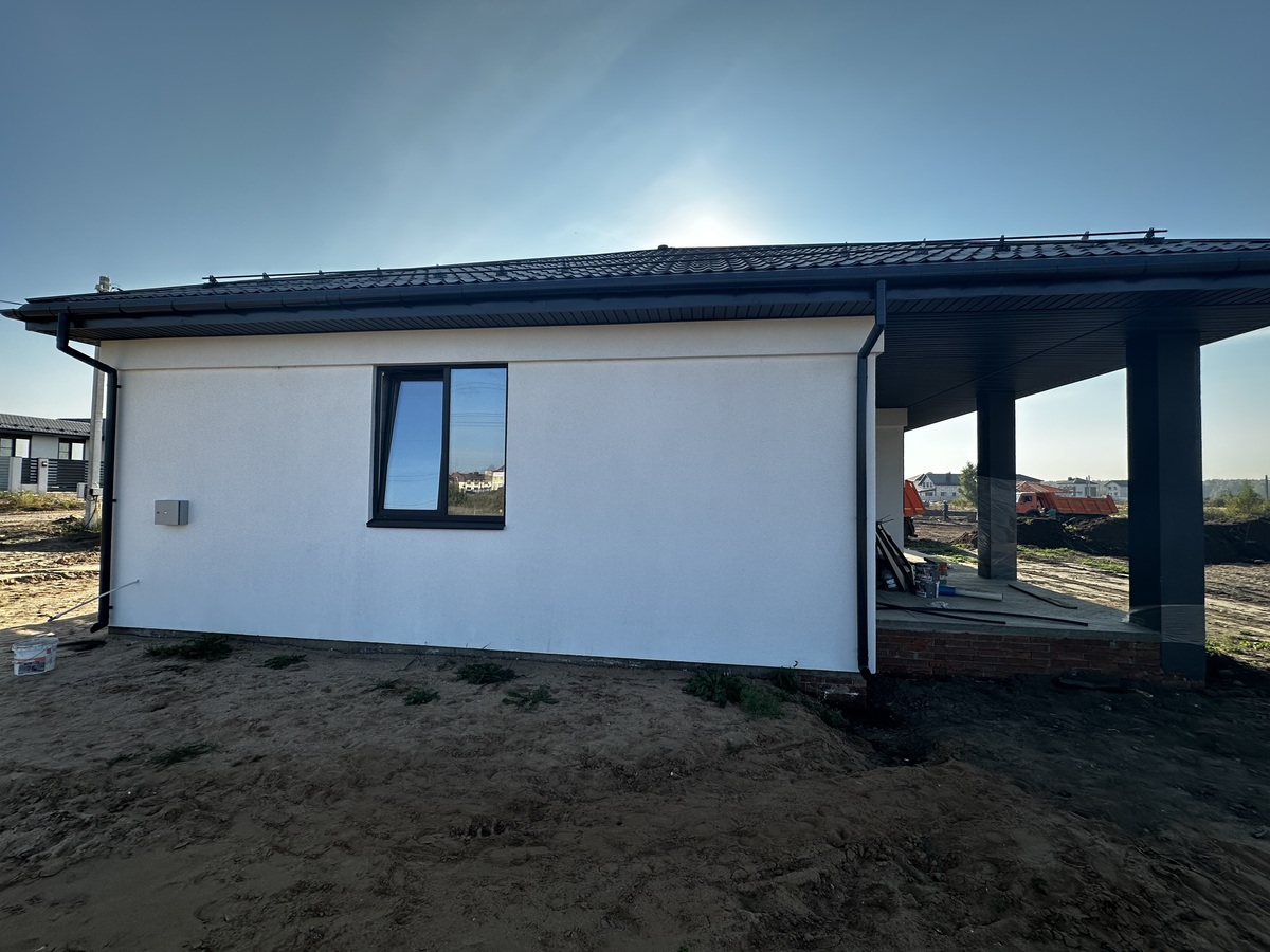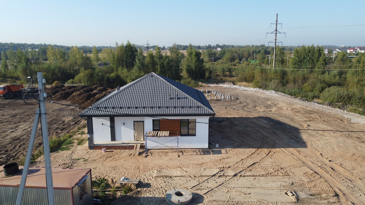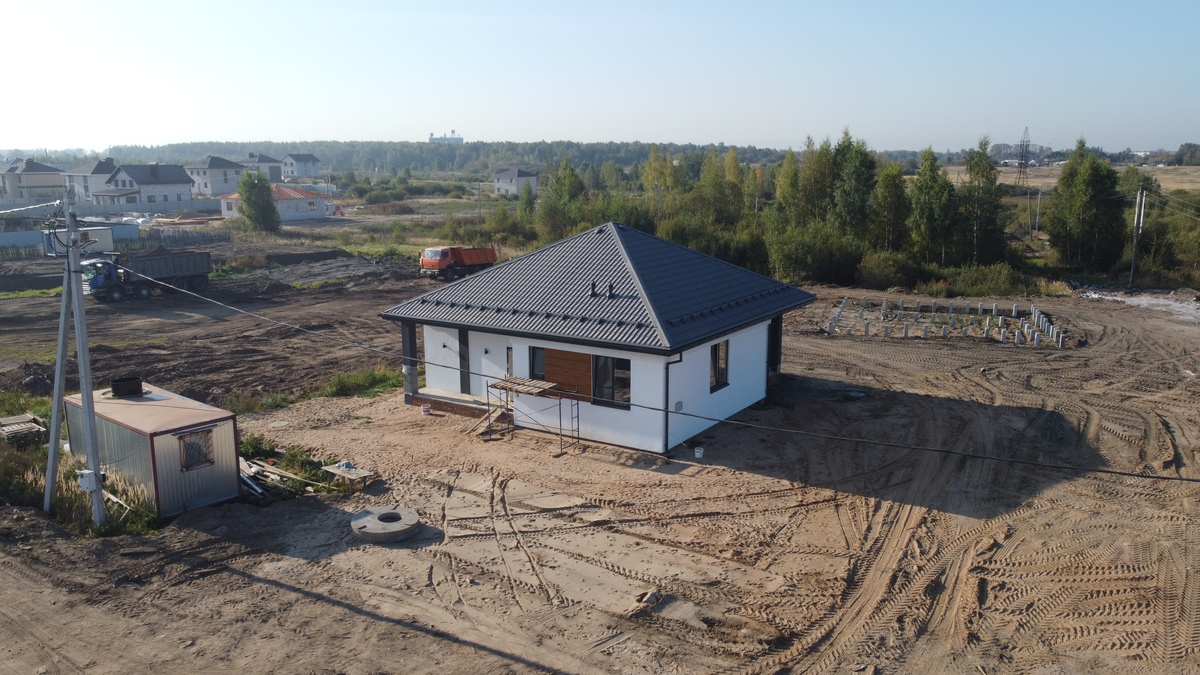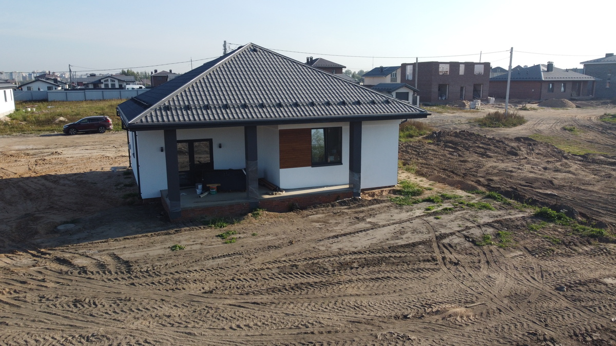 Отмостка шириной 1 метр по всему периметру дома выполнена из бетона, а водосточная система изготовлена из прочных серых полимерных материалов. Эти элементы обеспечивают надёжную защиту и долговечность конструкции.