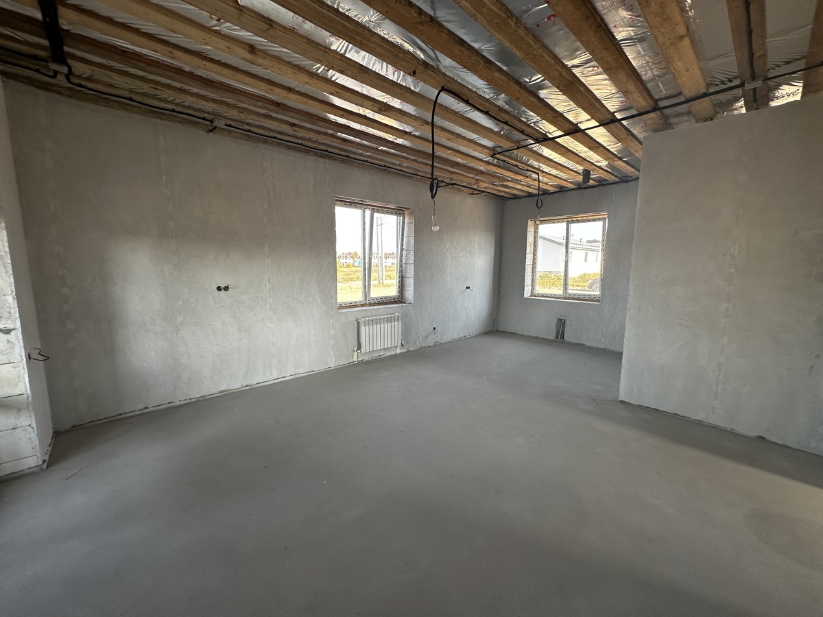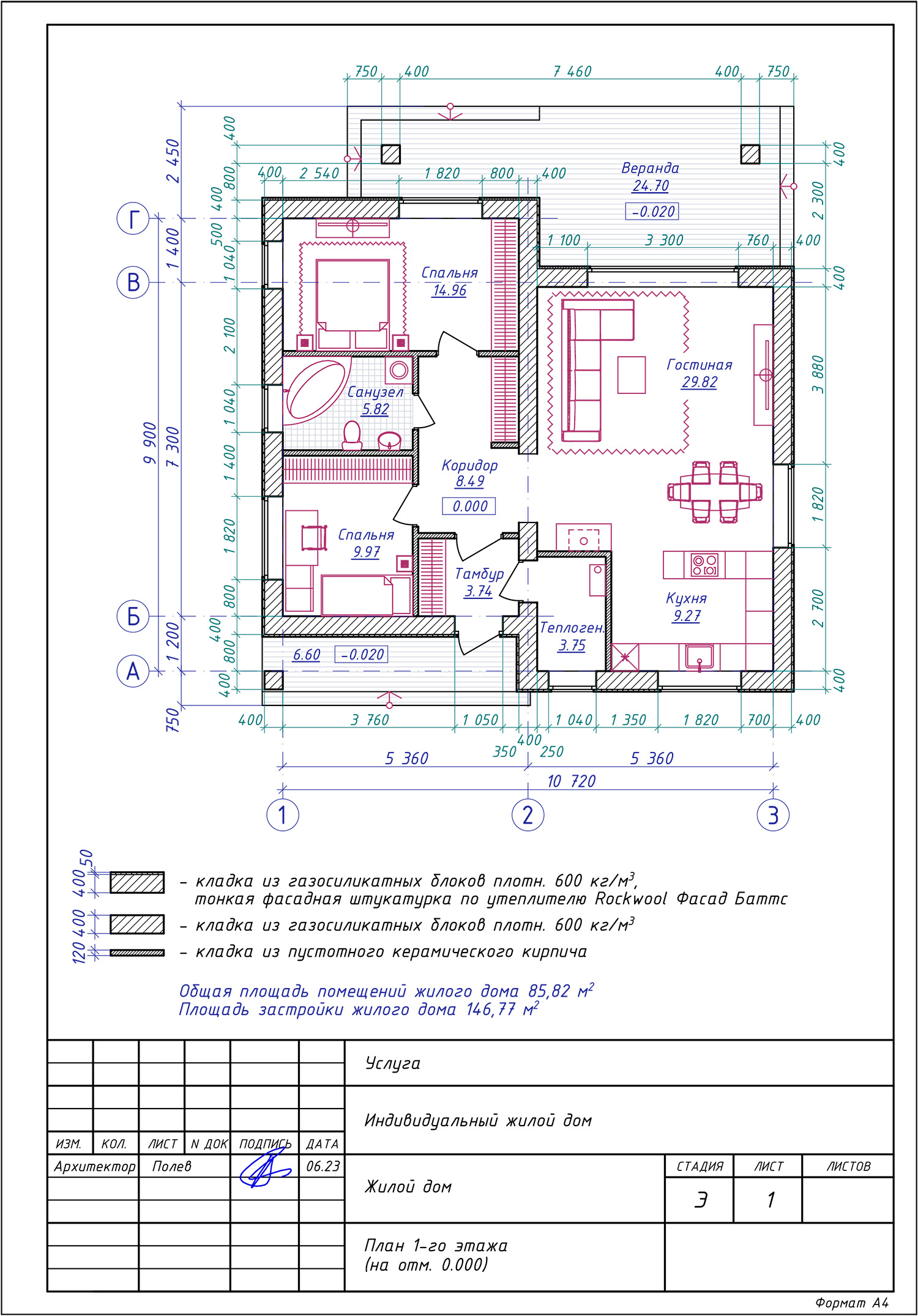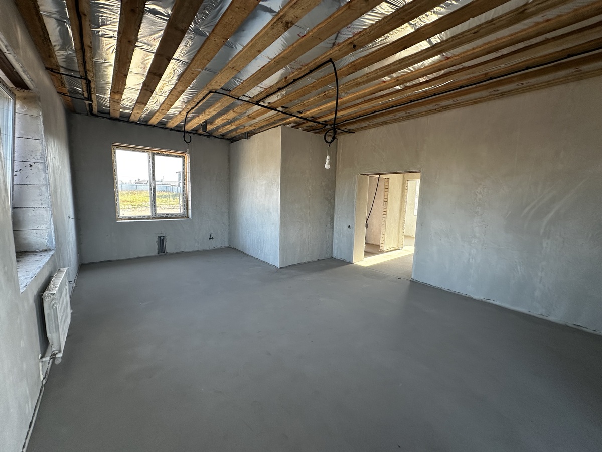 Дом построен на ленточном фундаменте с бурозабивными сваями. Капитальные стены выполнены из газобетонных блоков толщиной 400 мм с утеплением из минеральной ваты. Внешняя отделка включает декоративное покрытие “короед” и элементы декора в ореховых и серых тонах.
